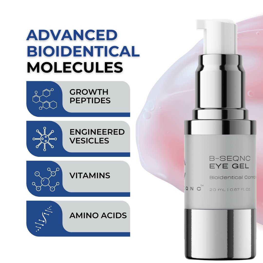 The B-SEQNC Eye Gel is meticulously designed to rejuvenate and protect the delicate eye area. This specialized gel boasts an 80% concentration of our innovative bioidentical complex, a formulation infused with bioengineered molecules including growth factors, engineered vesicles, and peptides.These elements are tailored to mimic and stimulate the skin's natural repair processes, making them exceptionally effective in addressing the specific concerns of the eye area.