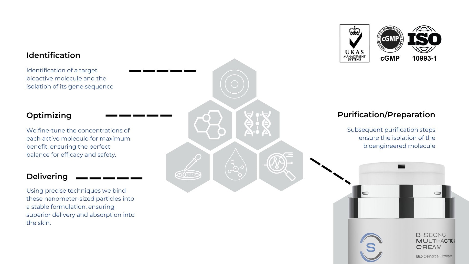 Nanotechnology is at the core of our bioidentical (B-SEQNC) formula. It involves the use of nano-sized particles or structures (nanoparticles) to enhance the effectiveness and delivery of active ingredients in skincare formulas. These nanoparticles typically range from 1 to 100 nanometers in size, allowing them to penetrate the skin's surface and target specific areas more efficiently. The nanoparticles are designed to encapsulate active ingredients, such as vitamins, antioxidants, peptides, and other bioactive compounds. Encapsulation helps protect the active ingredients from degradation and ensures controlled release, increasing their stability and effectiveness.